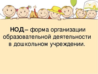 Непосредственно образовательная деятельность (НОД) в детском саду — это деятельность, основанная на одной из специфических детских видов деятельности (игровой, двигательной, коммуникативной, трудовой, познавательно-исследовательской и т. д.), осуществляемая совместно со взрослыми. Направлена на освоение детьми одной или нескольких образовательных областей или их интеграцию.