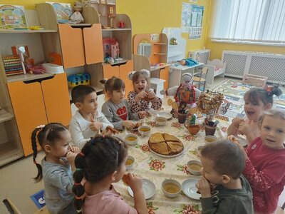 В детском саду сегодня было весело, шумно и интересно, ведь дети любят этот праздник. Любимый персонажи детей - кот Матроскин, Шарик, почтальон Печкин устроили весёлые масленичные забавы: дошкольники играли в различные игры, участвовали в конкурсах, водили хороводы.